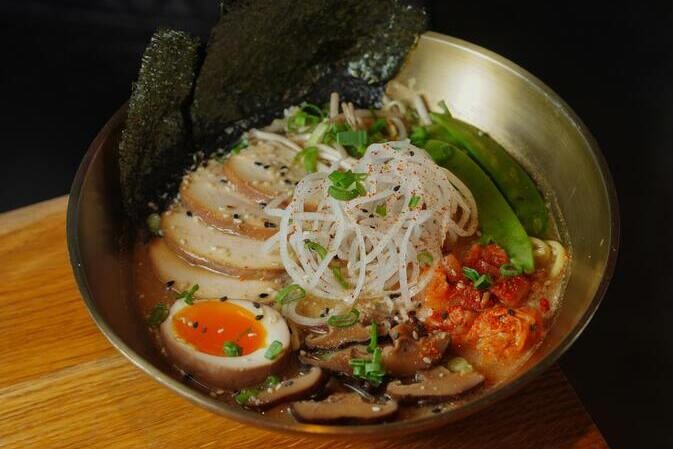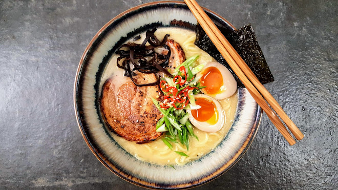 Bouillon de porc longuement mijoté, très onctueux. Garni de chashu grillé, champignons kikurage, œuf fondant et nori.